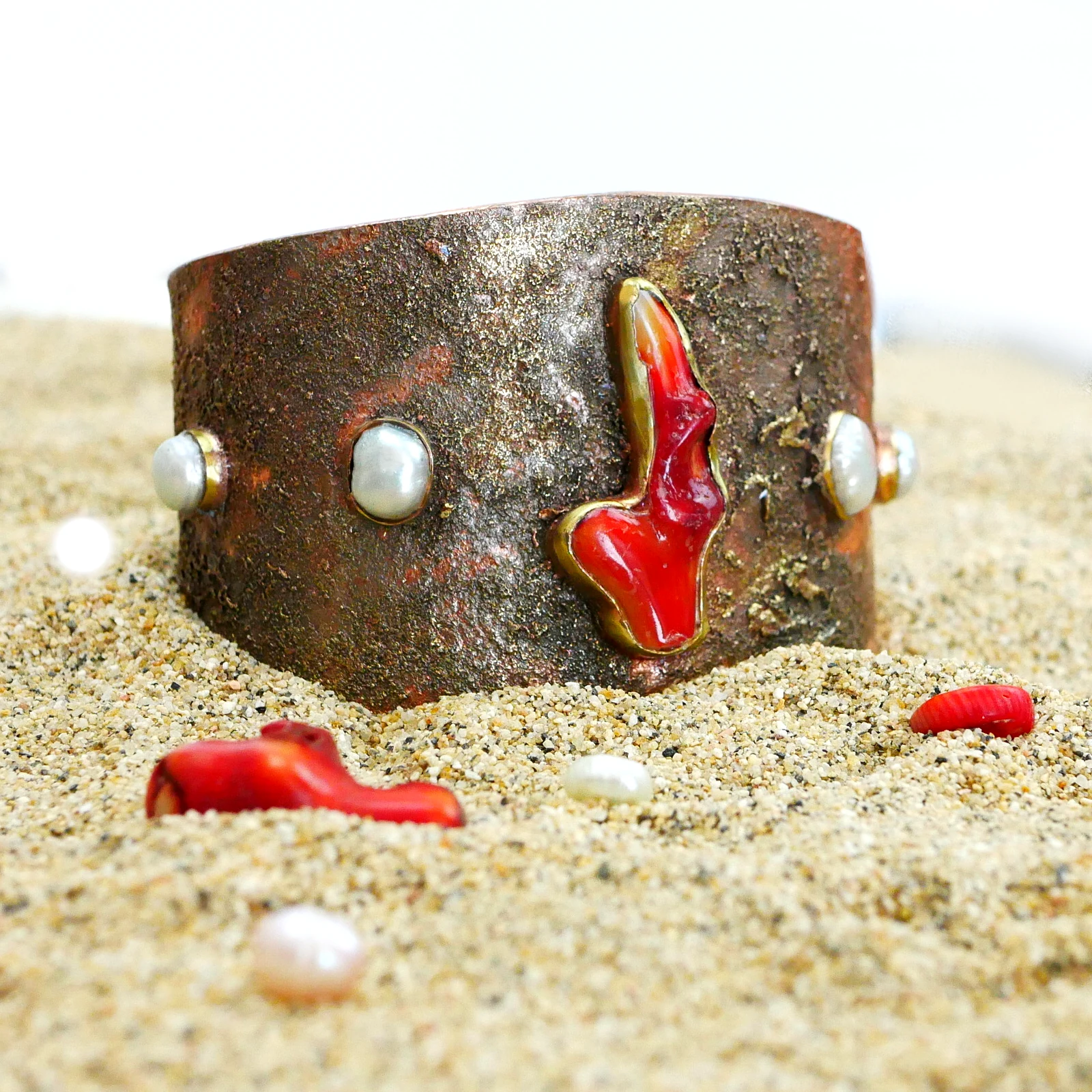 Wide cuff with sandy finishing red coral and pearls